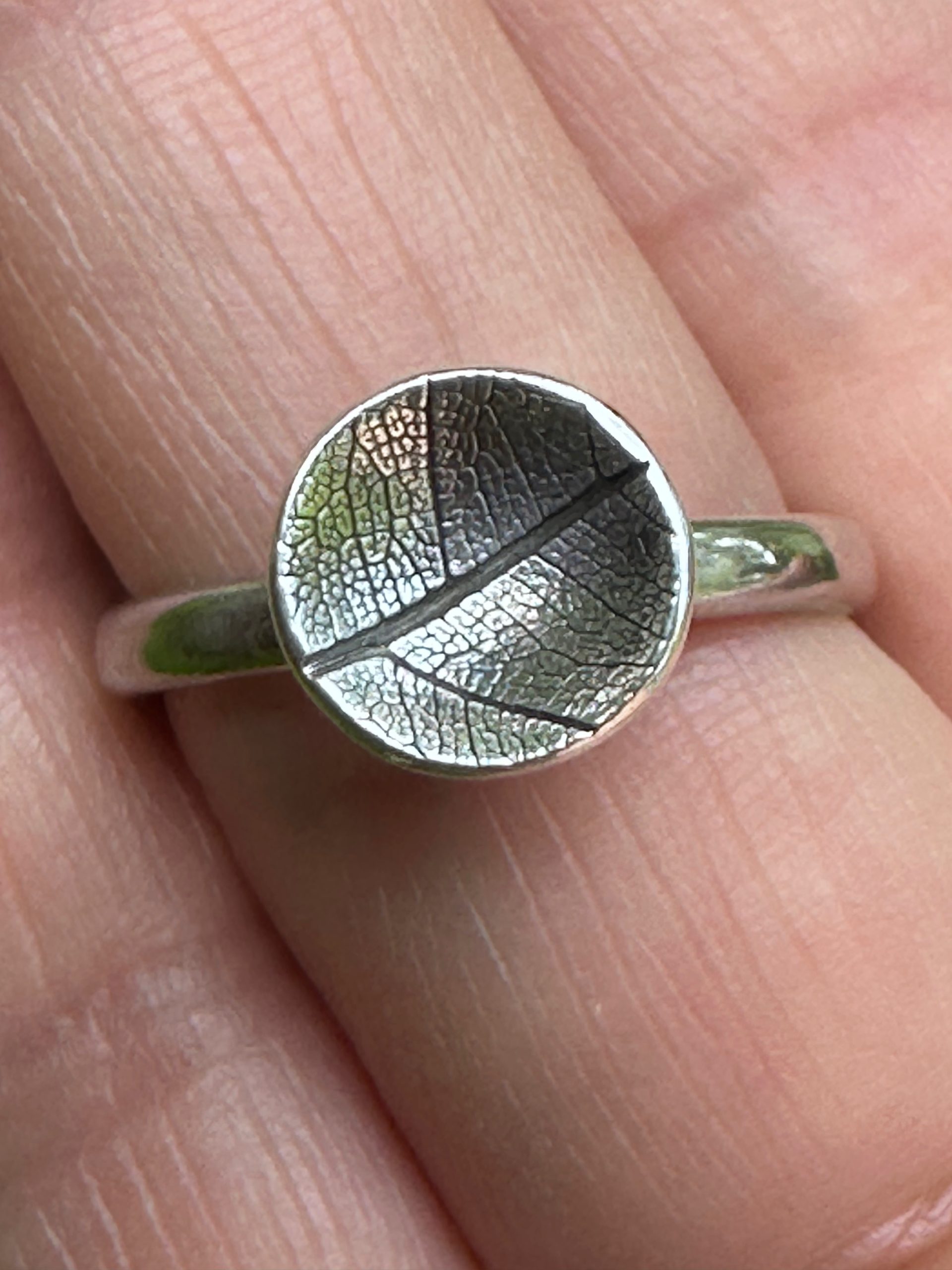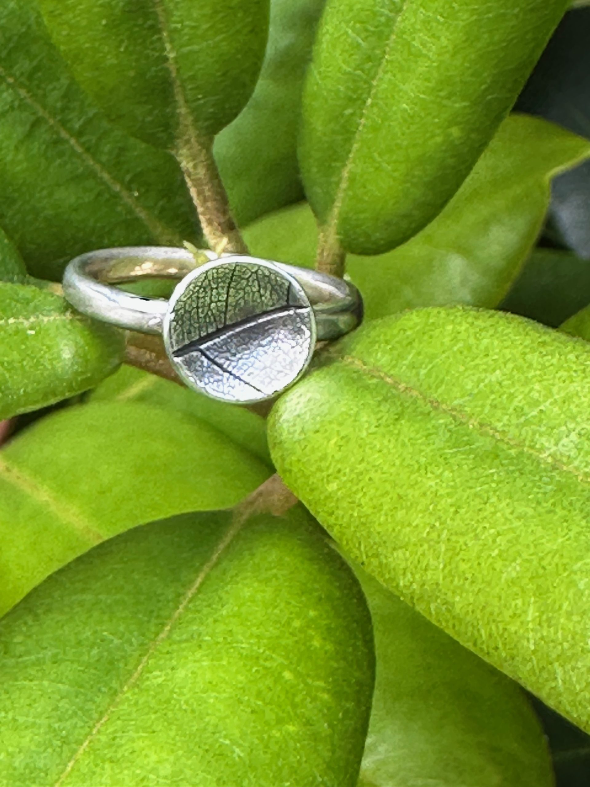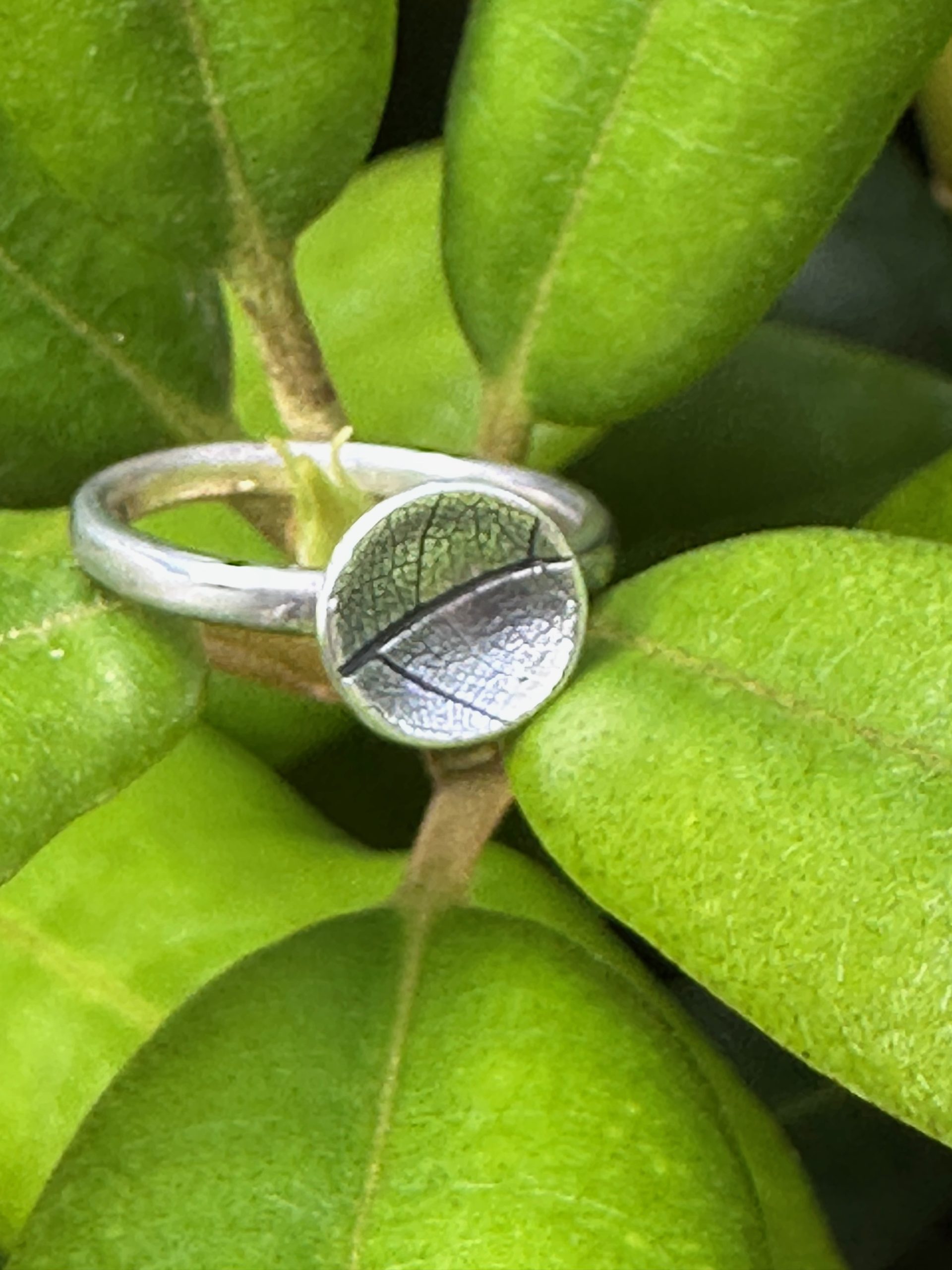Delicate, handcrafted leaf imprint silver ring capture the intricate veins of the leaf structure.